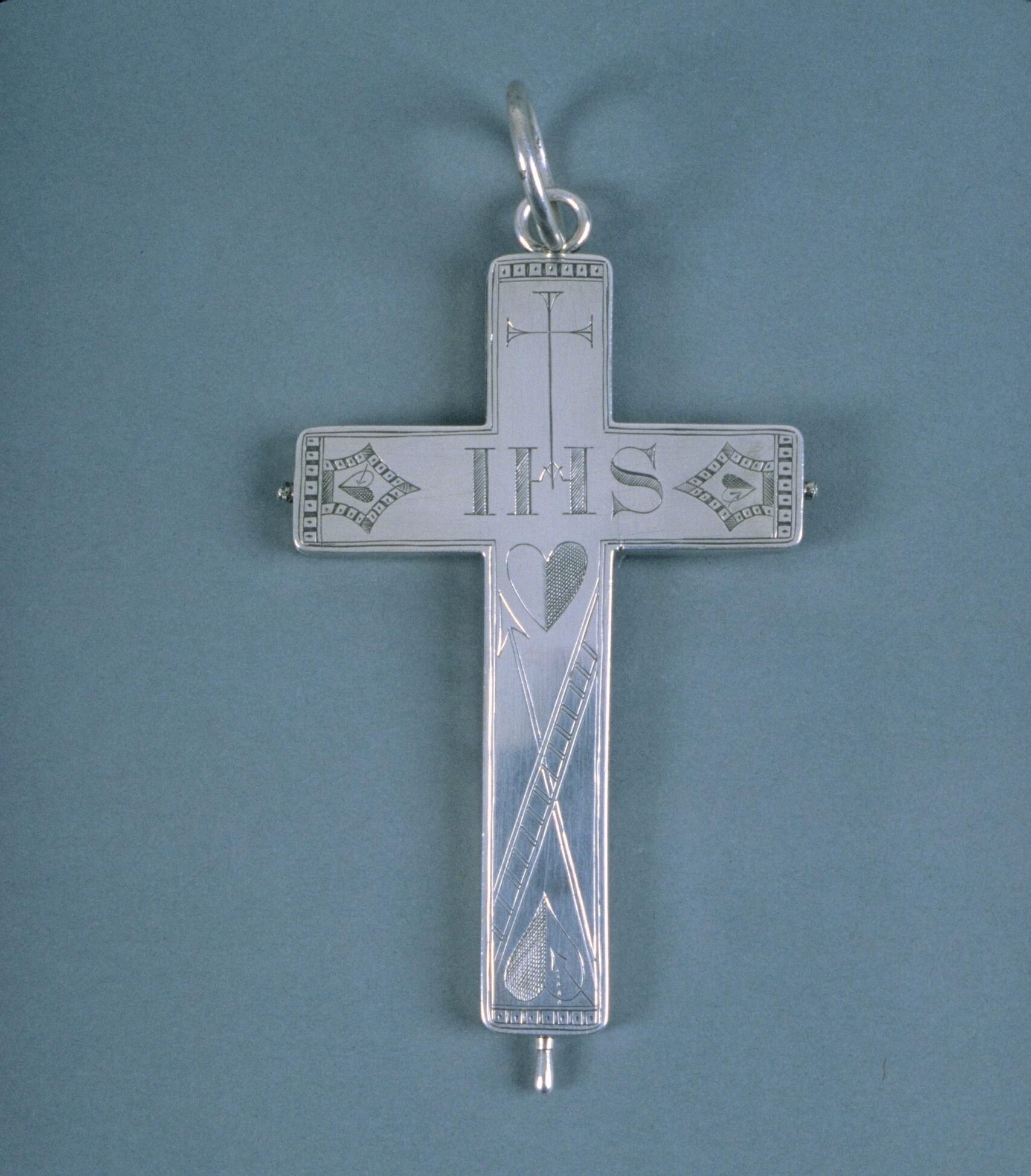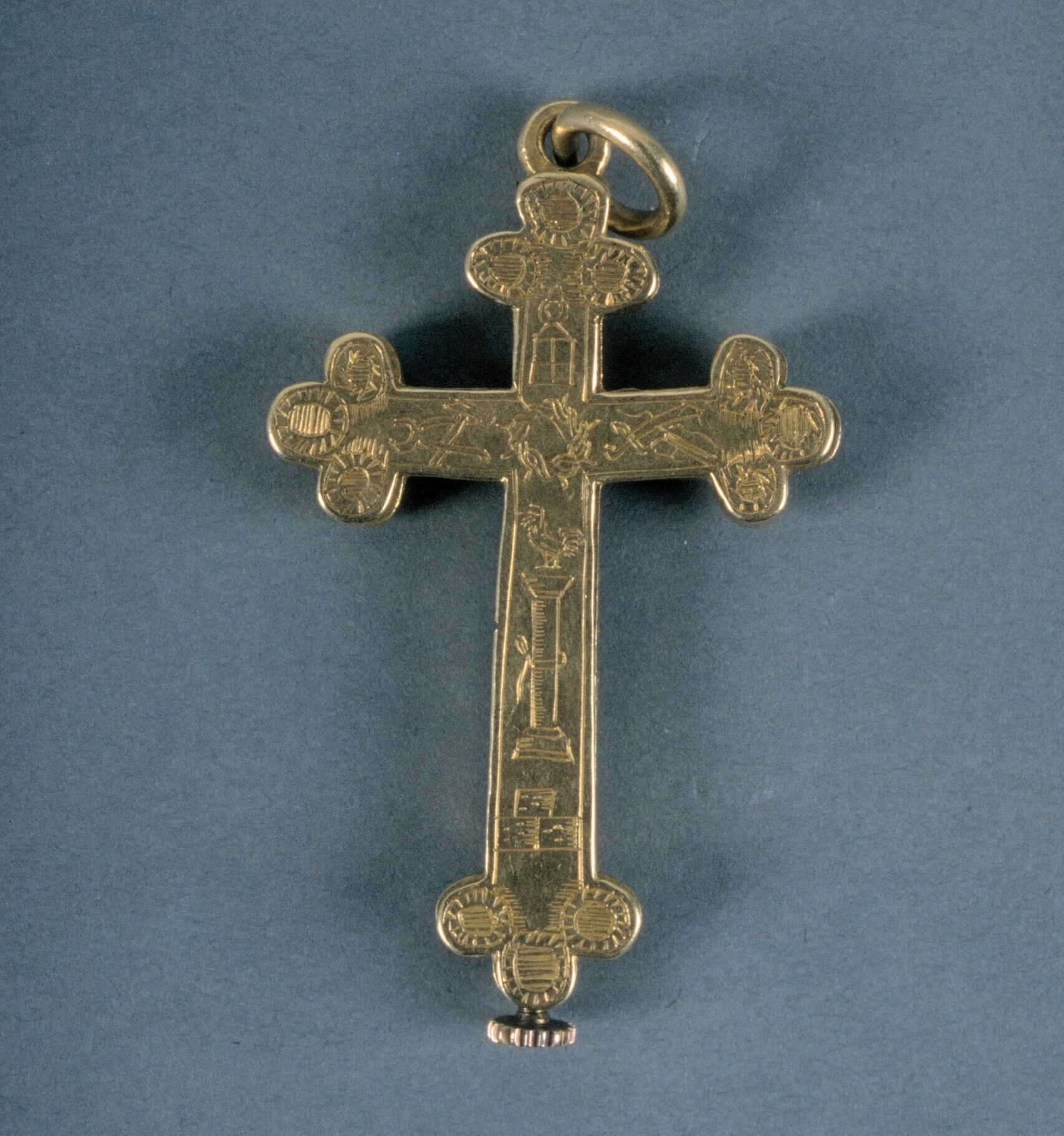 Another form of Christian reliquary is a crucifix with a small, internal compartment for storing the relic. The reliquary crosses in this exhibition were intended to be worn as pendants, which allowed the wearer to constantly be in possession of the relic. The intricate decorations on these crosses include engravings of the instruments of the passion and representations of Christ.