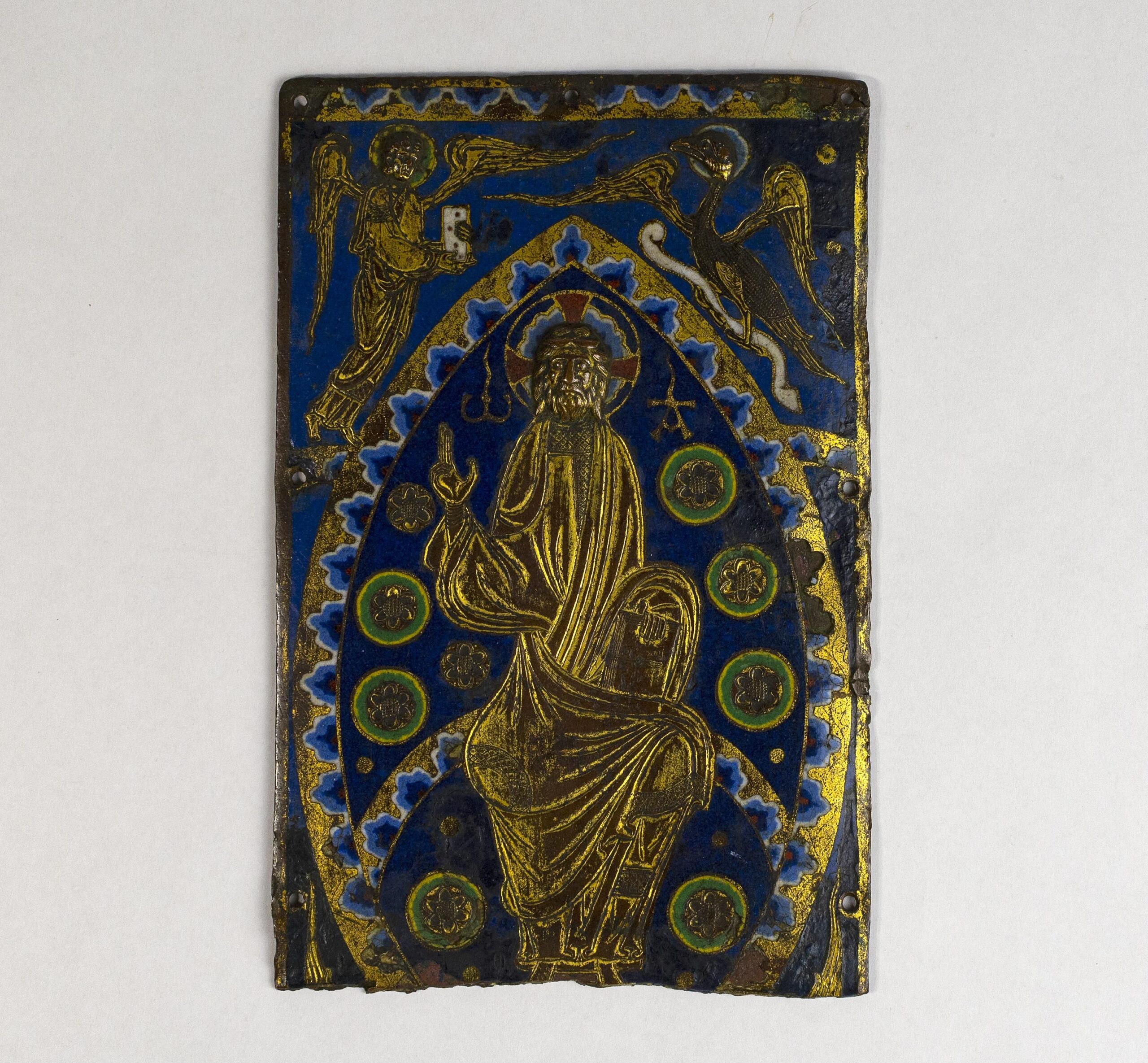 This plaque is named after Limoges, the city in France that pioneered this style of enamel. The plaque would have been inset into a highly decorated book cover and it may have been surrounded with precious jewels. These book covers are called ‘treasure bindings.’ The panel is decorated with a figure of Christ with his hand raised in the form of a blessing. It would have been bound to a Gospel lectionary manuscript or a similar religious text.