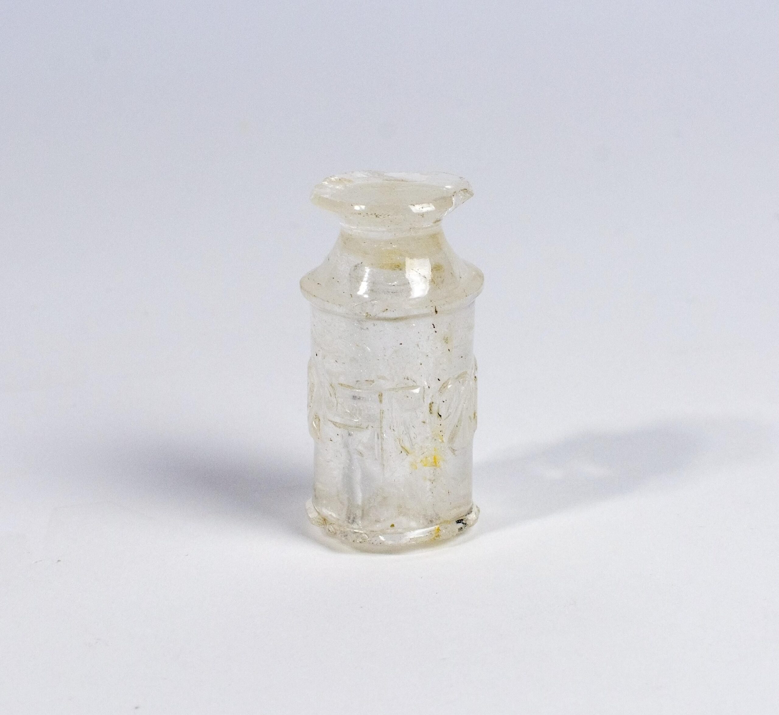 One such pendant reliquary is this miniature perfume flask. Created in Egypt in the 10th century, it was originally intended for perfume. Objects like this one made their way into churches, where their delicate shapes and intricate designs took on new meaning as Christian reliquaries. Some were given caps made of gold and enamel to protect their sacred contents.